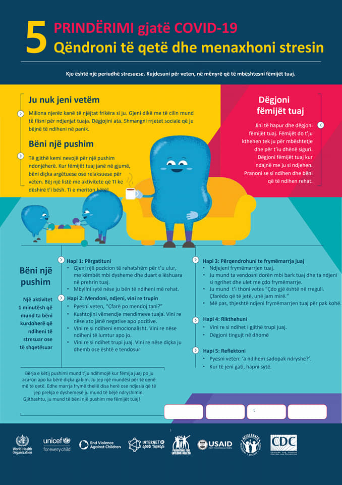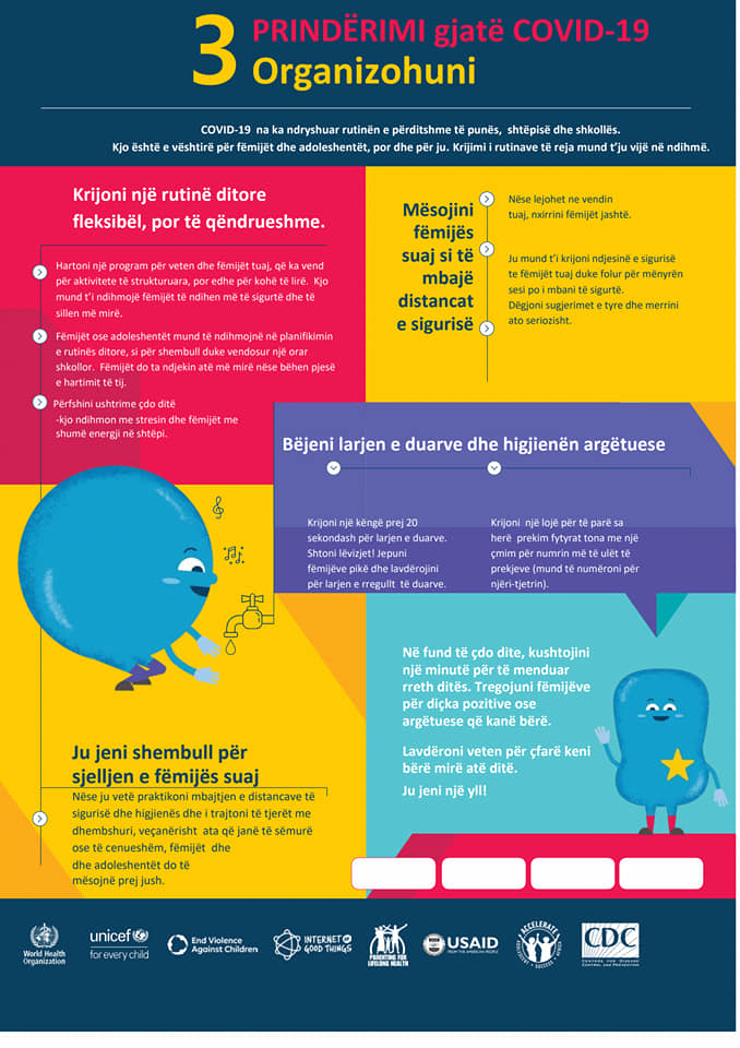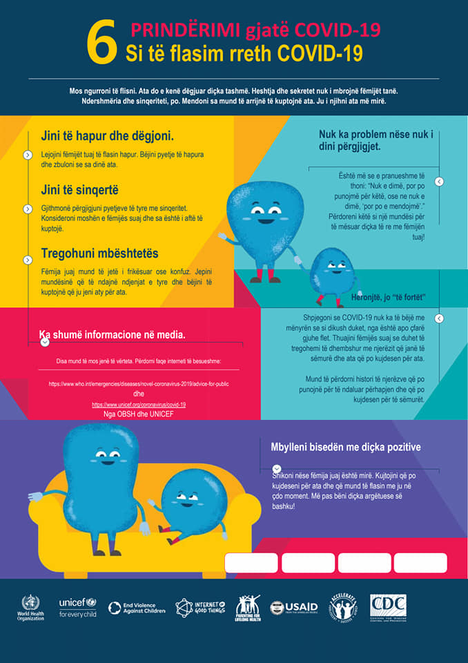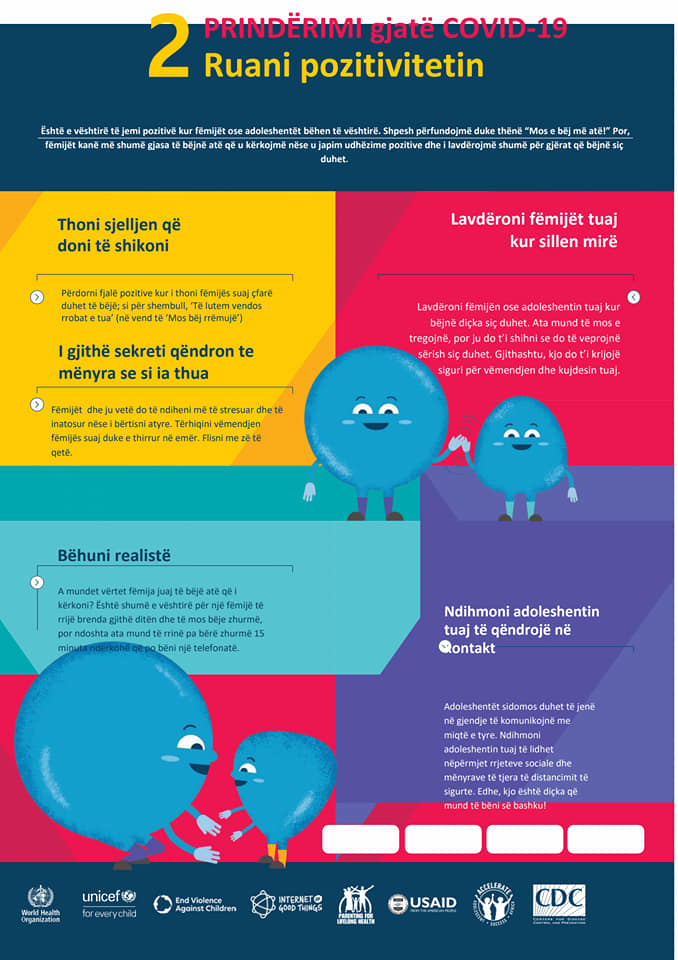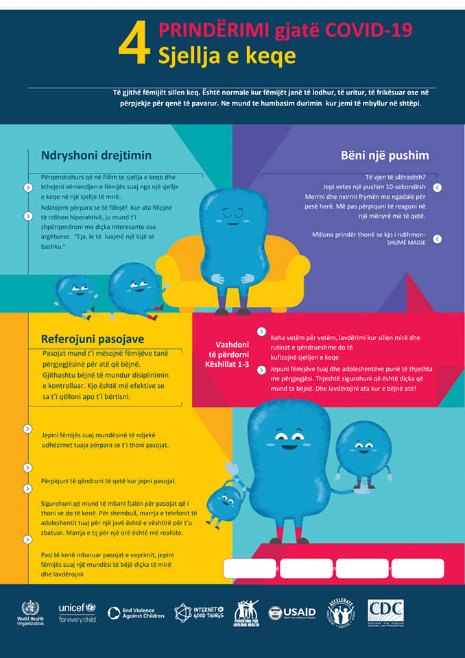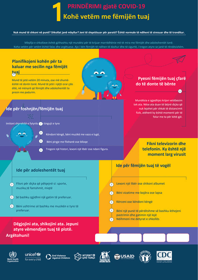 Në ditët e vështira që po hasim gjate gjendjes së fatkeqësisë natyrore për shkak të Covid19, fëmijët kërkojnë vemëndjen makismale të prindërve dhe institucioneve përgjegjëse. Por në këto ditë duhet të punojmë edhe në ndihmë të prindërve dhe qasjen e tyre ndaj fëmijëve gjatë periudhës së pandemisë. Për këtë arsye, Agjencia Shtetërore për të Drejtat dhe Mbrojtjen e Fëmijës në bashkëpunim me UNICEF Albania kanë hartuar disa prej këshillave mbi prindërimin gjatë Covid19